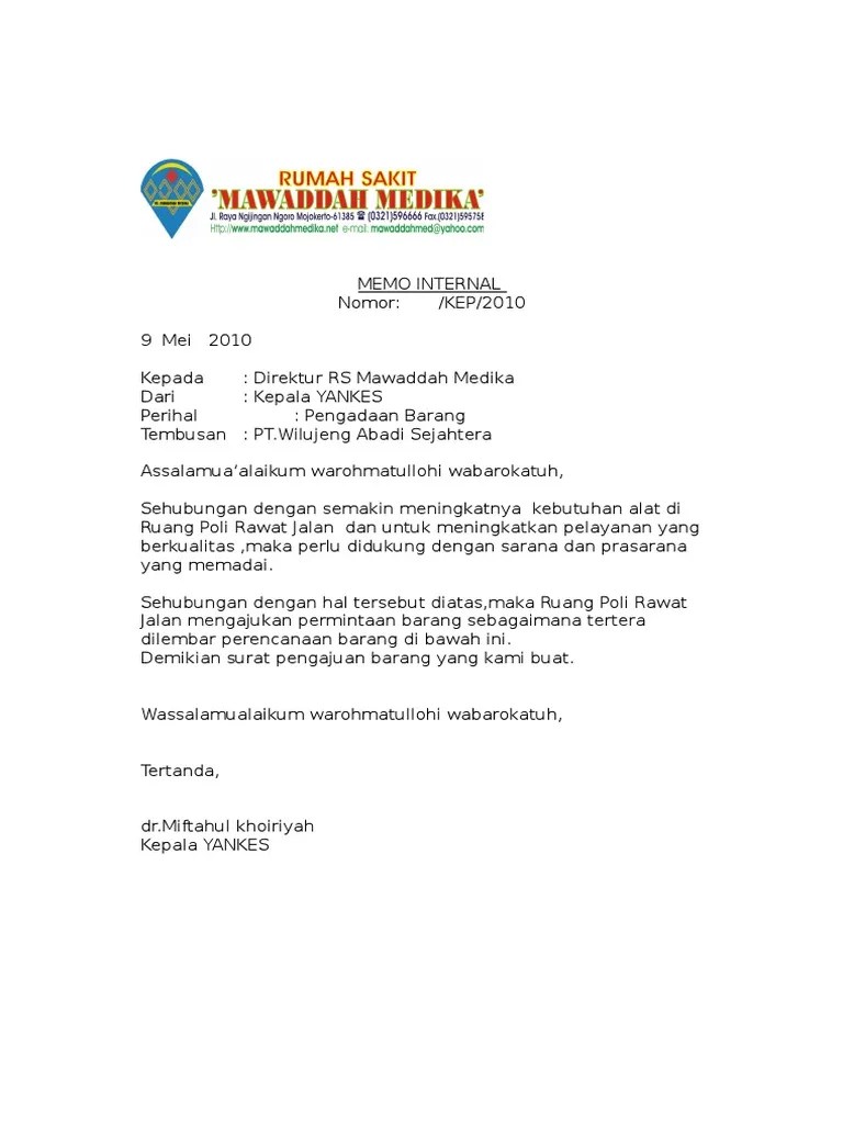 Biasanya disusun sesuai dengan format yang telah ditetapkan oleh suatu perusahaan secara formal sehingga anda bisa menemui contoh surat yang . Karyawan/ karyawati diwajibkan mengisi form permohonan cuti dengan cara . Rmk pt rmk energy coal trading & m ining se rvic e s internal memo palaran,. Internal memo merupakan pesan singkat dan jelas untuk kalangan sendiri. Tanggal __ ______ ____, dengan ini perlu kami sampaikan bahwa perusahaan memiliki . Berikut di bawah ini contoh internal memo perusahaan dari departemen ke . Berikut adalah contoh memo internal dari perusahaan penerbitan fiksi . Memorandum (memo), adalah pesan atau catatan singkat yang digunakan. Kumpulan contoh memo / memo resmi / tidak resmi / sekolah / perusahaan / internal perusahaan / pribadi / organisasi / pengertian / jenis / bagian / singkat. Surat pengajuan barang ke perusahaan surat pengajuan barang ke sekolah surat pengajuan barang atk Buat kamu yang memiliki ikatan dengan perusahaan atau instansi tertentu, pastinya kamu wajib mengetahui cara penulisan surat pemberitahuan yang . Terkait perkembangan pekerjaan diatas dan berdasarkan perjanjian nomor. Dengan hormat saya selaku bagian it mengajukan permohonan penambahan sarana kerja berupa komputer dan printer kepada manajemen pt.