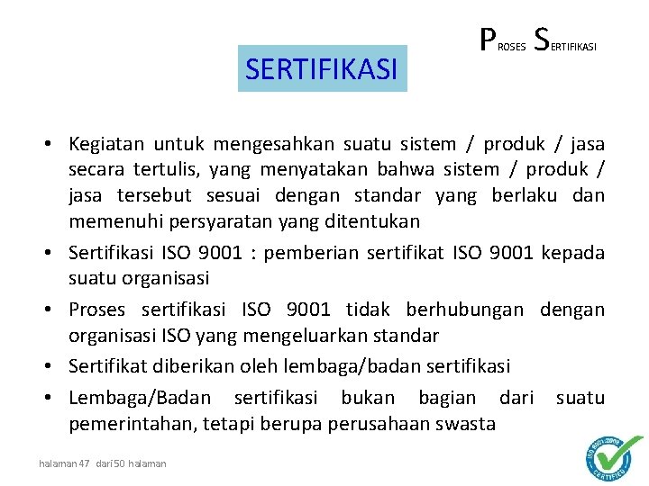 Sertifikasi hanya menyatakan bahwa bisnis proses yang berkualitas dan konsisten dilaksanakan di perusahaan atau organisasi atau perpustakaan .